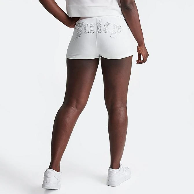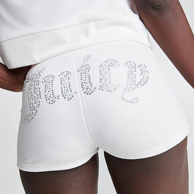 - Supersoft and stretchy short shorts with faux pearl and rhinestone embellished JUICY logotype on backside