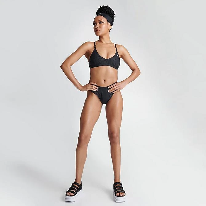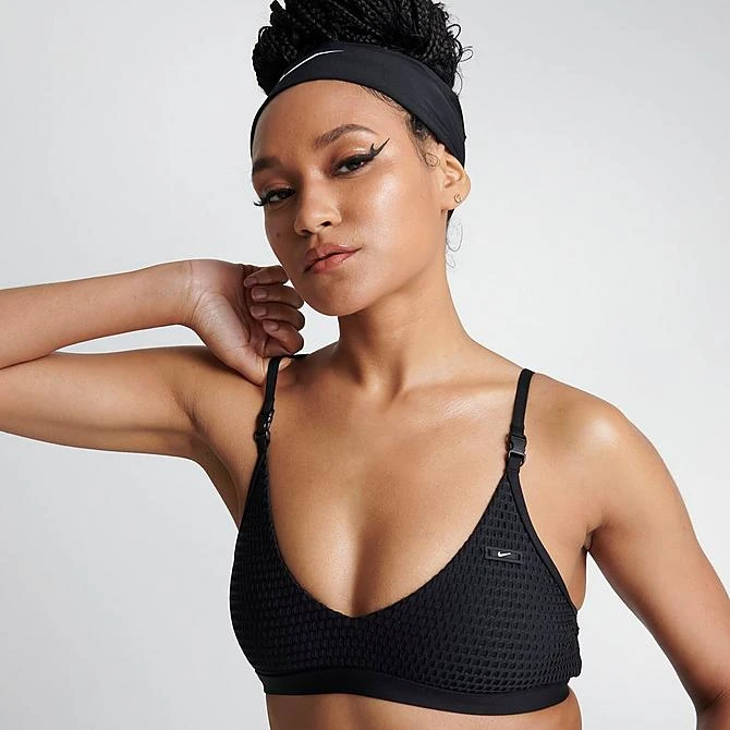- Light support swim sports bra with mesh overlay and rubberized Nike Swoosh logo label at left chest